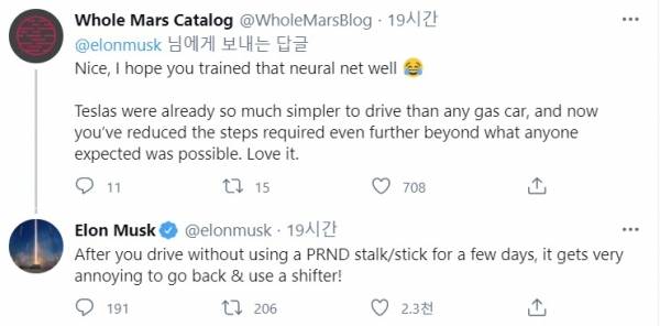 변속 방법에 대한 궁금증을 일론 머스크가 간단하게 해결했다. 일론머스크가 보낸 트윗의 답장을 보면 차량에 장착된 카메라와 내비게이션 정보를 활용해 주행 방향을 차량이 스스로 추측하는 것으로 보인다. 만약 주행 방향(전진 혹은 후진)을 마꾸고 싶다면 터치 스크린을 사용하면 된다고 답했다. 이를 통해 기어노브는 터치 스크린 안에 자리잡을 것으로 예상된다. 여기 더해 일론머스크는 기어를 변속하는 일이 성가시게 느껴진다면 새로운 방식의 기어 변속에 대한 기대감을 높이고 있다. 방향지시등은 스티어링휠에 위치한 버튼을 이용할 것으로 예상된다.