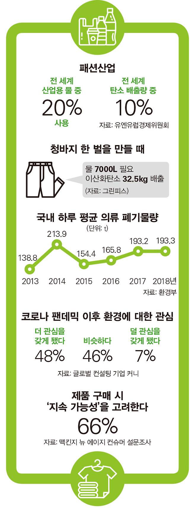 일단 옷이 만들어지는 데는 생각보다 많은 양의 물이 사용된다. 유엔유럽경제위원회에 따르면 전 세계에서 사용되는 산업용 물의 20%가 의류를 만드는 데 쓰인다. 목화를 생산하기 위해 사용되는 살충제는 전 세계 농약 사용량의 20%에 달한다. 그린피스는 청바지 한 벌을 생산할 때 물 7000리터가 필요하며, 그 과정에서 이산화탄소가 32.5kg 배출된다고 분석하기도 했다. 만드는 것도, 세탁도, 버리는 것도 문제다. 국제자연보전연맹(IUCN)이 2017년 내놓은 보고서에 따르면, 미세플라스틱 오염의 35%가 패스트 패션 브랜드에서 생산한 합성섬유 세탁으로 인한 것으로 추정된다. 화학섬유는 자연적으로 분해되는 데 수년의 시간이 걸린다. 폐기된 옷이 썩거나 소각될 때는 지구 온난화의 원인이 되는 이산화탄소, 메탄가스가 배출된다.