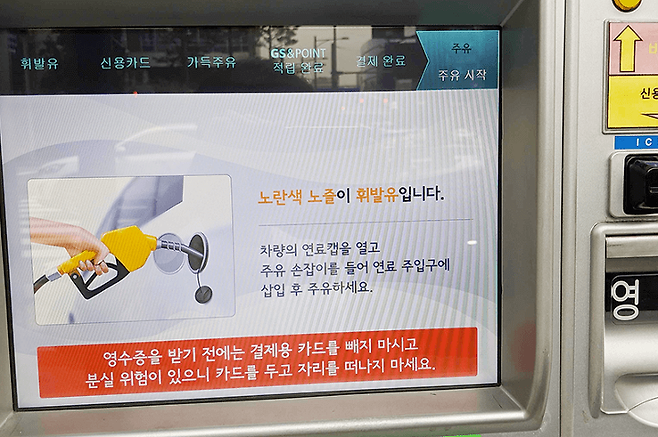 유종을 선택하고 카드 결제 화면까지 왔는데 휘발유인데 경유가 선택되어 있었다면? 심지어 '취소'버튼도 없고 주변에 직원도 없다면 어떻게 해야 할까요?