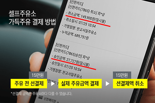 가득주유시 결제는 '가득 선택 - 15만원 선결제 - 주유금액 확정 - 주유금액 승인 완료 - 15만원 선결제 취소'의 프로세스로 이루어 집니다. 그런데 카드 한도나 잔액이 부족하면, 주유금액 결제 후 15만원 선결제 취소가 정상적으로 이루어지지 않는 경우가 있는데요. 때문에 셀프주유 후에는 선결제 취소가 제대로 되었는지 영수증을 꼭 확인해보는 습관이 중요합니다.