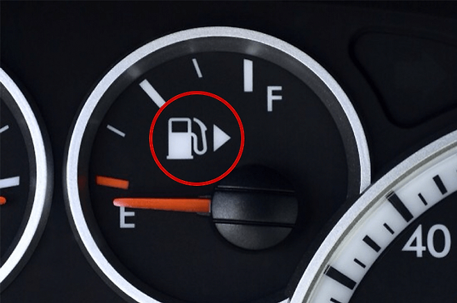 위 사진과 같이 계기판 주유소 아이콘 옆에는 화살표가 있습니다. 이 화살표는 바로 주유구의 위치를 알려주는 표시로, 화살표가 오른쪽을 가리키면 차체의 오른쪽에, 왼쪽을 가리키면 차체의 왼쪽에 주유구가 있다는 뜻입니다.