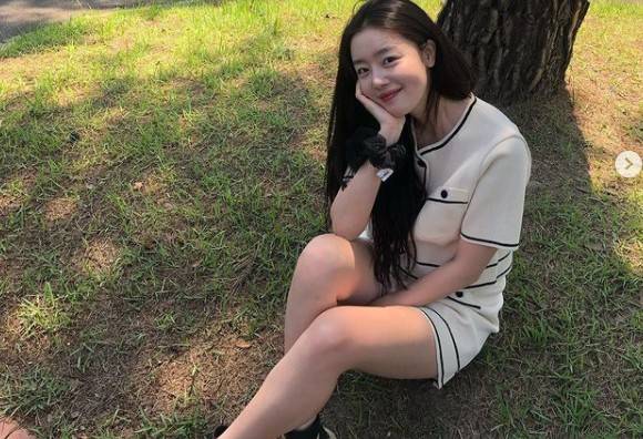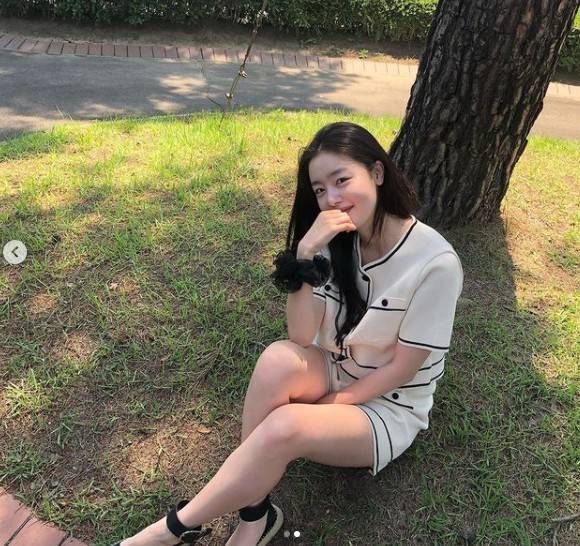 사진 속 한선화는 잔디에 앉아 포즈를 취하고 있는 모습.