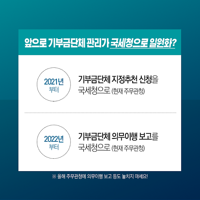 2021년부터 기부금 지정추천 신청을 국세청으로(현재 주무관청)