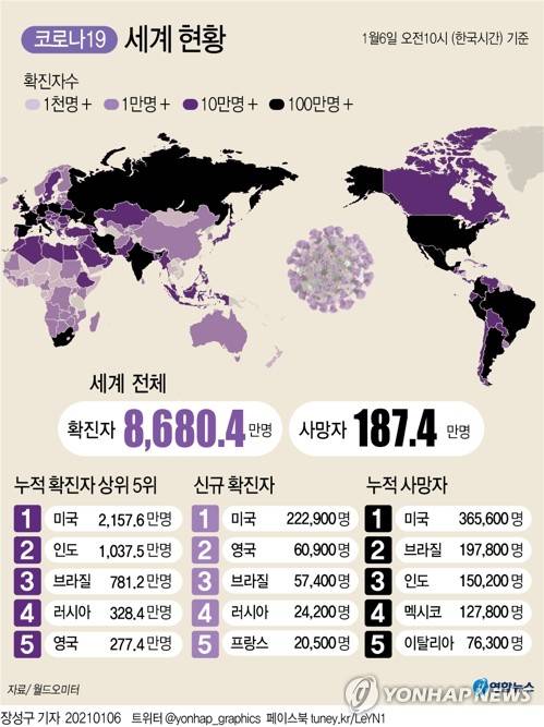 (서울=연합뉴스) 장성구 기자 = 국제통계사이트 월드오미터에 따르면 한국시간 6일 오전 10시 기준으로 세계 신종 코로나바이러스 감염증(코로나19) 누적 확진자 수가 8천680만명을 기록하고 있다.