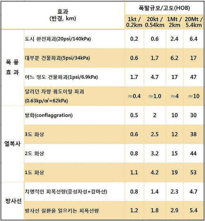 핵폭탄의 위력(yield)은 TNT 폭탄으로 같은 양의 폭발을 일으킬 수 있는 무게로 표시된다. 히로시마에는 약 15kt, 나가사키는 약 20kt의 원자폭탄이 투하되었다. 그 결과 폭심지(Ground Zero)로부터 1km 이내의 사람은 87%가 사망을 하였고, 2.5km 이내의 목조건물은 전소함으로써 히로시마에서는 16만여 명 나가사키에서는 7만여 명 정도가 사망한 것으로 알려지고 있다. 히로시마와 나가사키는 목조주택으로 인한 화재발생과 의료 및 행정체계가 마비됨에 따라 신속한 응급 및 구호 미비로 2차 피해가 컸다. 화상으로 인한 사망이 가장 컸으며 폭심지로부터 800미터 이내의 95% 인원이 사망했는데 직접적인 화상으로 인한 사망이 25%, 방사능 피폭으로 인한 사망이 20%, 부상 등 2차 피해로 인한 사망이 50%를 차지하였다. 건물은 폭풍으로 인해 9만 채 중 현대식 건물 다섯 동만 재사용 가능할 정도였다. <표 2>에서처럼 20kt급 폭발 시 반경 4.7km에 있는 건물은 약간 파괴되는 정도(유리창 파손 등)의 폭풍 피해를 입는 데에 비해 2.5km 범위 내에 있는 사람은 열복사 효과로 인해 3도 화상을 입을 수 있다. 핵폭발의 최초효과에 의한 희생자를 추산 방법은 폭심(ground zero)을 기준으로 5psi 폭발 압력선 내에 있는 모든 사람이 사망한다고 보는 것이다.