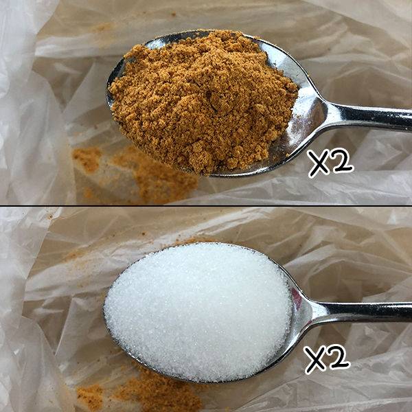 2인분용으로 계량함! 라면스프 2숟갈, 설탕 2숟갈을