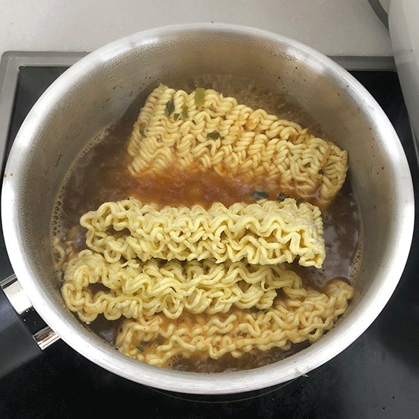 일단 끓는 물에 스프와 건더기를 일반 라면 끓이듯이