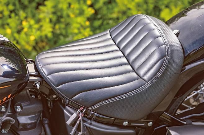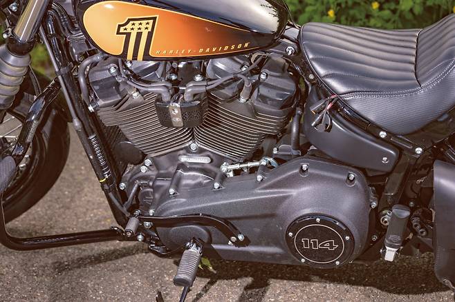 스트리트밥 114는 이름처럼 1,868cc(114큐빅인치)의 밀워키에이트114엔진을 장착한다. 2021년 스트리트밥의 가장 큰 변화점이 바로 이 엔진이다. 더 강력해진 토크와 즉각적인 엔진반응, 그리고 풍부한 고동감이 돋보이는 엔진으로 지금까지 스페셜 모델에 주로 쓰던 것인데 스트리트밥에 기본으로 장착한 것이다. 2020년 모델까지는 107(1,745cc)엔진이었다. 처음 시동을 걸면 엔진의 열을 올리기 위해 회전수가 ‘부우웅’하고 높아지지만 예열을 마치고 안정된 아이들링 회전수는 850rpm 내외이며 가끔 790rpm까지 떨어진다. 순정치고는 회전수가 상당히 낮은데 이때 느껴지는 고동감이 특히 좋았다. 회전수가 낮아질수록 V트윈 엔진 특유의 엇박자가 더 명확하게 느껴진다.