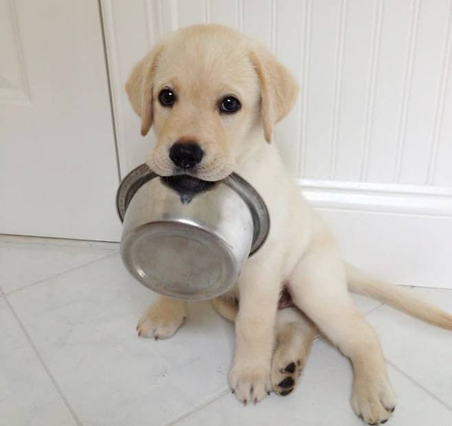 강아지는 배가 고프면, 밥그릇을 물고 다니기도 합니다.