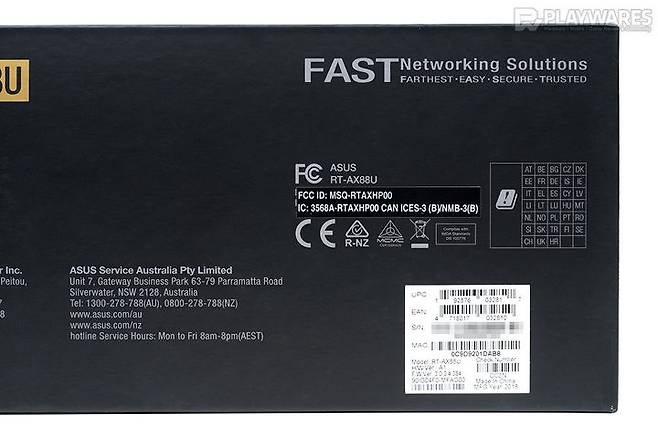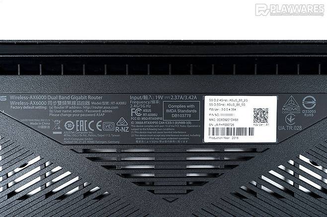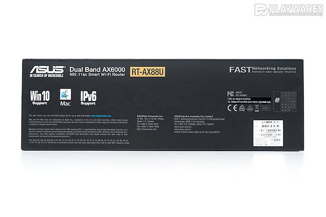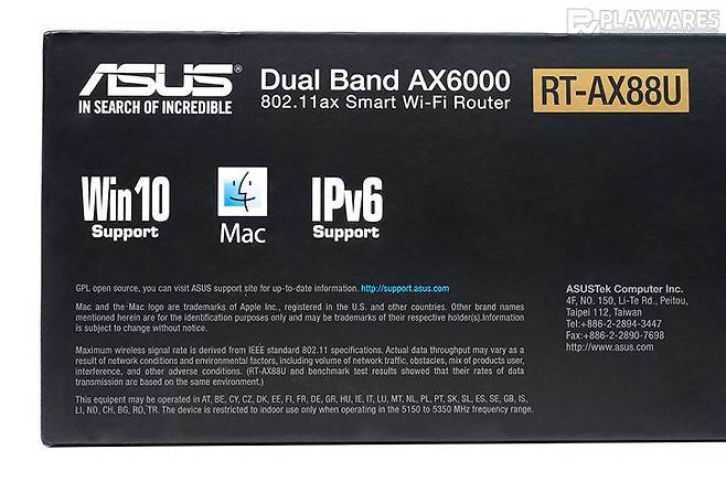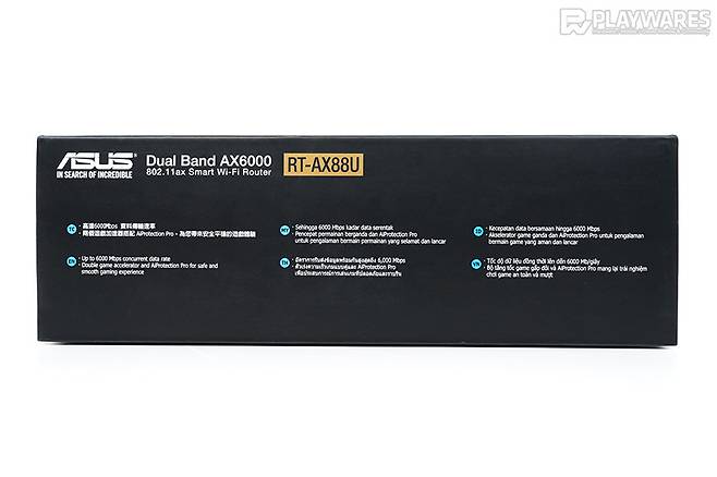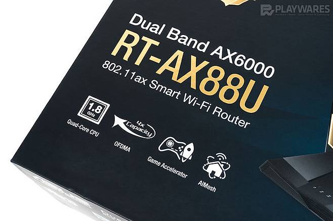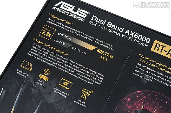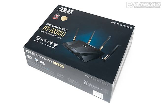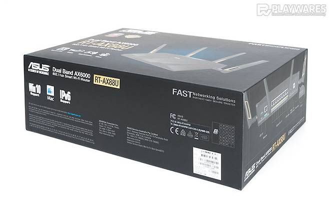 지금까지 802.11 AX의 진행 로드맵을 간단히 살펴보자면 2016년 10월 17일 Quantenna가 Draft 1.0을 호환하는 개발자용 802.11 AX 칩셋인 QSR10G-AX를 최초로 발표했고, 뒤이어 17년 2월과 8월, Qualcomm과 Broadcom이 각각 802.11 AX 칩셋을 발표했습니다. 그리고 2017년 8월 30일에 개최된 IFA 2017에서 ASUS가 세계 최초의 802.11 AX 공유기를 공개함으로써 본격적인 802.11 AX 규격 상용화의 신호탄을 쏘아 올렸고, 이후로도 지속적으로 Draft가 갱신되며 세부 사항들이 수정되어 나가고 있습니다. 2019년 3월에는 Draft 5.0의 선정 투표를 진행할 계획이며 이때 선정이 완료되는 것을 기준으로 2019년 7월 초기 스폰서를 선출한 이후 2020년 1월 RevCom(검토위원회)에 표준 승인을 거쳐 공식적으로 데뷔하게 됩니다. 물론 완전히 공식적인 규격이지는 않지만 각 Draft에 맞춰 제품들이 출시되고 있는데, 그중 하나가 이번 리뷰를 통해 소개해드릴 ASUS RT-AX88U (AX6000)입니다. ASUS RT-AX88U는 최대 4,804Mbps의 데이터 전송이 가능한 802.11 AX(5GHz)와 1,148Mbps 전송을 지원하는 802.11 AX(2.4GHz)를 지원하고 있고, 이전 세대인 802.11 A/B/G/N/N(1024-QAM)/AC/AC(1024-QAM)를 모두 활용할 수 있습니다.