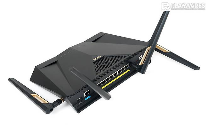 AP는 최초의 64bit 1.8Ghz 쿼드코어 프로세서인 Broadcom의 BCM49408를 사용하고 있고, 256MB의 플래시와 1GB RAM을 탑재하고 있습니다. 대형 안테나는 송수신을 겸하며 5GHz/2.4GHz 각각 4x4 MU-MIMO로 구동하게 됩니다. 인터페이스로는 1개의 기가비트 WAN, 유선 공유를 위한 8개의 LAN 포트를 탑재하고 있어 NAS와 PC, 노트북 등에 다중 연결하는 것이 가능하고, 2개의 기가비트 이더넷 케이블을 2개의 링크 구성으로 안정성을 확보하는 Link Aggregation도 지원해 NAS 및 내부 네트워크 파일 공유 등에서 활용하기에도 좋습니다. 이와 함께 전면 및 후면에 각각 1개씩 총 2개의 USB 3.1 Gen1 포트를 갖추고 있어 AIDisk 기능을 통한 간이 NAS 구축도 가능하고, ASUS 고유의 AiMesh 연동도 가능해 더욱 넓은 커버리지를 확보하는 것도 가능합니다.