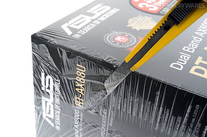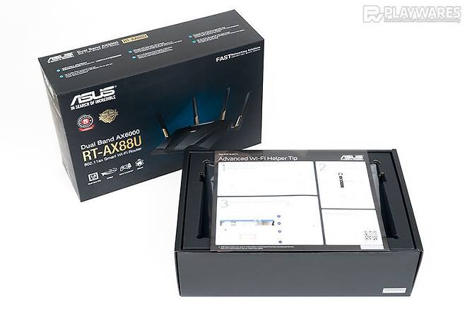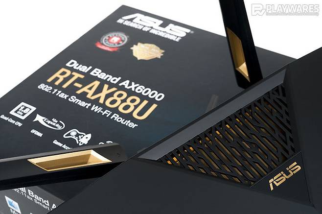 다만 아직까지 802.11 AX 규격을 지원하는 노트북 및 데스크톱용 Wi-Fi 칩셋, 그리고 스마트폰용 AP 등이 전혀 출시되지 않았기 때문에 해당 공유기의 완전한 성능을 확인할 방법이 요원합니다. 그래도 내년 초에 발표될 Qualcomm Snapdragon 855 프로세서가 802.11 AX 규격을 정식 지원하겠다고 밝힌 상태이고, 인텔에서도 역시 Harrison Peak라는 코드명을 가진 M.2 2230/1216 Wi-Fi 칩셋 Wireless-AX 22560의 출시를 목전에 두고 있는 상황이기 때문에 빠르면 내년 2분기에는 802.11 AX 기반 무선 네트워크 시스템을 완전히 활용할 수 있을 것으로 보입니다. 따라서 해당 리뷰의 테스트는 일반 실사용 환경에 가까운 SKT 기가 인터넷(1Gbps) 환경에서 테스트를 진행하였으며, 향후 이보다 빠른 네트워크 환경과 기기 스펙을 온전히 지원하는 조건에서는 리뷰 상에 포함된 속도보다 훨씬 빠른 네트워크 속도를 제공할 것이라는 점을 사전에 이해하시길 바랍니다. 그렇다면 국내 최초로 출시된 802.11 AX 규격 공유기, ASUS RT-AX88U (AX6000)의 패키지와 외형, 설정 환경 및 네트워크 성능은 어떨지 자세히 알아보도록 하겠습니다.