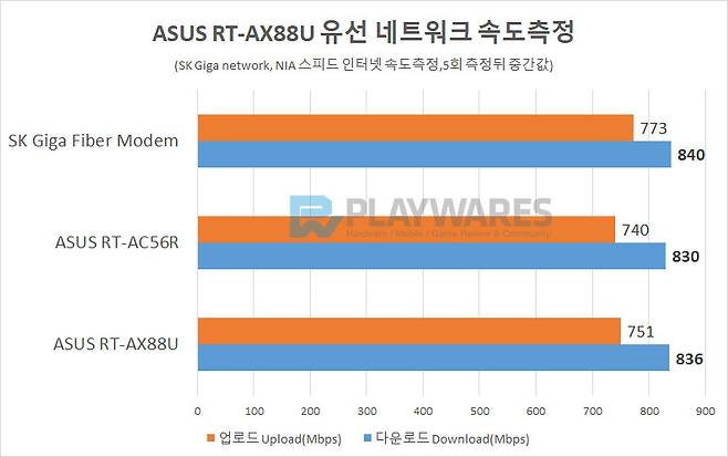 우선 기가 인터넷 모뎀과 PC를 직접 연결한 상태에서는 840Mbps의 다운로드 속도와 773Mbps의 업로드 속도를 보이고 있습니다. 그리고 ASUS RT-AX88U 공유기에 연결한 이후 PC와 직접 연결한 상태에서는 836Mbps의 다운로드 속도와 751Mbps의 업로드 속도를 보이고 있습니다. 또한 대조군에 사용된 ASUS RT-AC56R은 830Mbps의 다운로드 속도와 740Mbps의 업로드 속도를 보입니다. 이러한 점을 종합적으로 비교해보자면 두 공유기 모두 1Gbps 기반 유선 공유를 지원하기 때문에 실질적인 속도 차이는 없는 수준이라고 할 수 있겠으며 상위 기종인 ASUS RT-AX88U의 데이터 전송에 따른 손실률이 조금 더 적다는 수준의 데이터로 보실 수 있겠습니다.