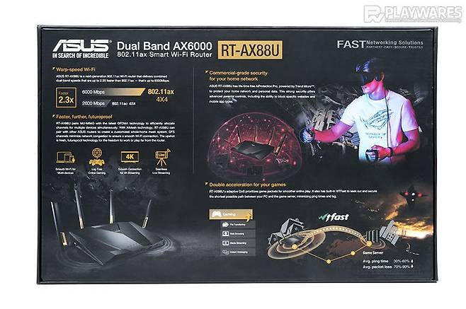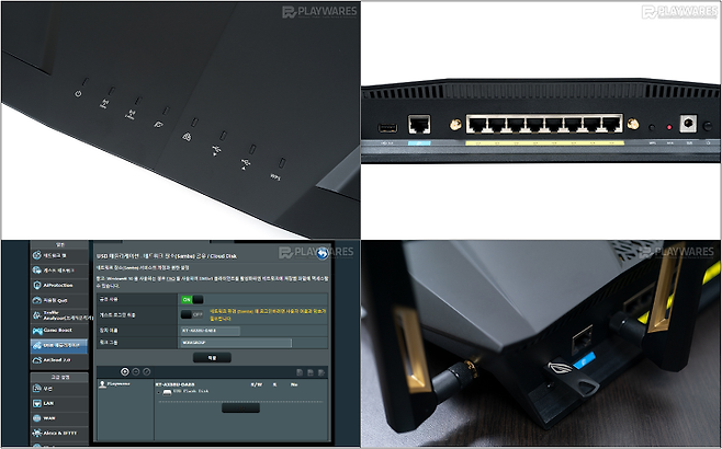 이 외에도 ASUS 공유기를 통한 커버리지 확장 기능인 AiMesh 기능, 서비스 품질의 우선순위 작업을 자동으로 보정해주는 Adaptive QoS, 2개의 USB 3.1 Gen1 포트에 연결된 외부 저장 장치를 간이 NAS로 활용할 수 있게 해주는 AiDisk 기능, 개인 웹 링크를 접속할 수 있는 AiCloud 2.0, 게이머들을 위한 자동 패킷 경로 추적인 WTFast 기능과 대역폭 집중 기능인 LAN Boost, AiProtection을 통한 실시간 네트워크 보호 등의 다양한 기능을 제공해 무궁무진한 커스터마이징 적용이 가능하겠습니다.