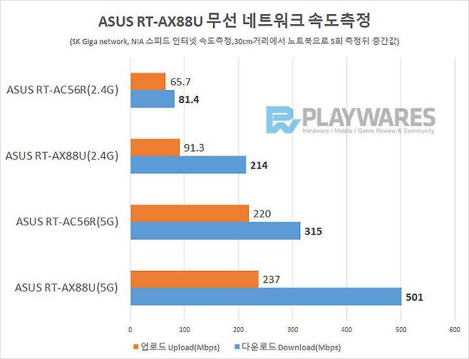 다만 해당 테스트에서 참고하셔야할 점으로는 ASUS RT-AX88U의 무선 인터넷 측정 기기가 하위 버전인 802.11 AC로 진행되었다는 점입니다. 이는 아직까지 801.11 AX 규격을 지원하는 랜카드 및 기기가 전혀 출시되지 않았고, 최대 속도를 테스트 할 수 있는 10기가 인터넷 서비스 역시 아직까지 극히 제한적인 지역에서만 가능해 테스트 환경 자체를 구축할 수 없었기 때문입니다. 따라서 해당 테스트에서는 이 점을 참고하시고, 추후 802.11 AX 기반 제품이 출시되면 더욱 빠른 속도를 제공할 것이라고 보시면 되겠습니다.