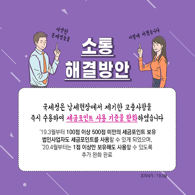 위와 같은 한계를 줄이고자 국세청은 납세현장에서 제기한 고충사항을 즉시 수용하여 세금포인트 사용 기준을 완화하였습니다!