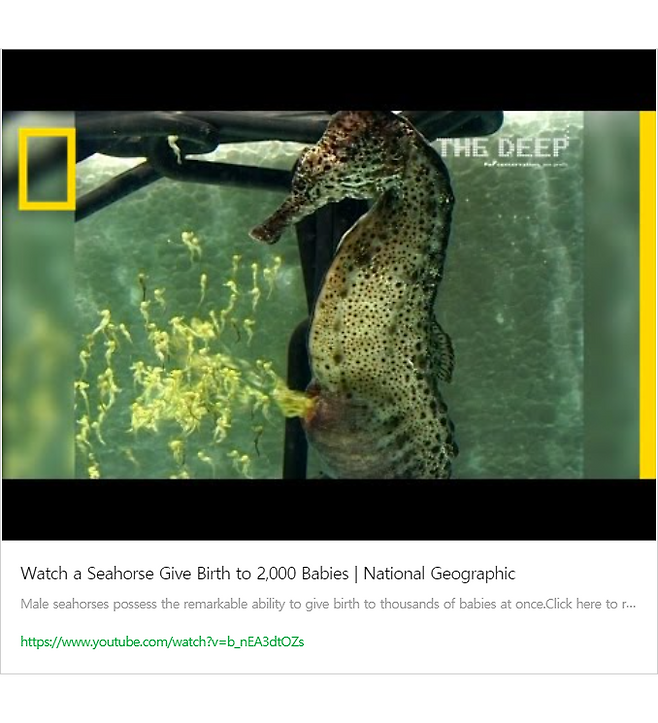 해마는 수컷이 알을 낳는다. 수컷 해마의 배에 있는 주머니에 암컷 해마가 난자를 넣어두면 그곳에서 난자가 수정되어 배아가 된다. 수컷이 임신하는 셈이다. 수컷은 주머니 속 배아에 산소를 제공하고 염분 농도를 적당히 유지해가며 기르고 뿜어내듯 출산한다. 수컷 해마가 출산하는 장면을 담은 영상을 꼭 찾아보길 권한다.