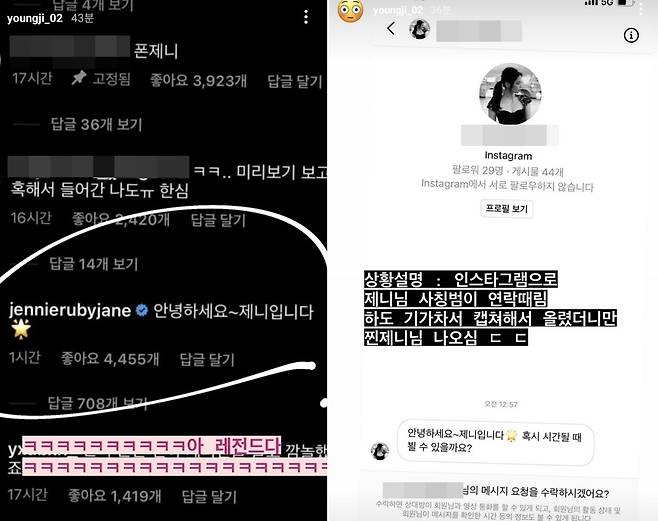 이에 누리꾼들은 "제니가 사칭 DM을 본 것 같다" "진짜 제니가 등장했다" "상황이 너무 웃기다" "센스 대박이다"라는 반응을 보였다.