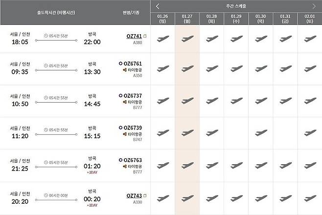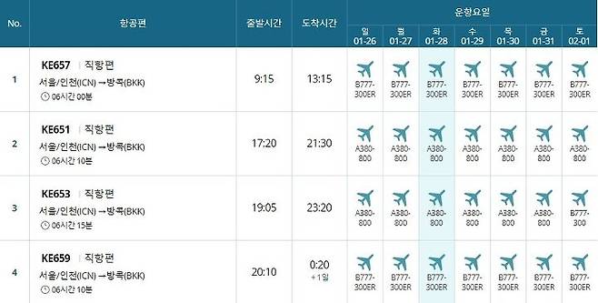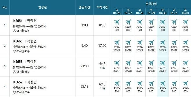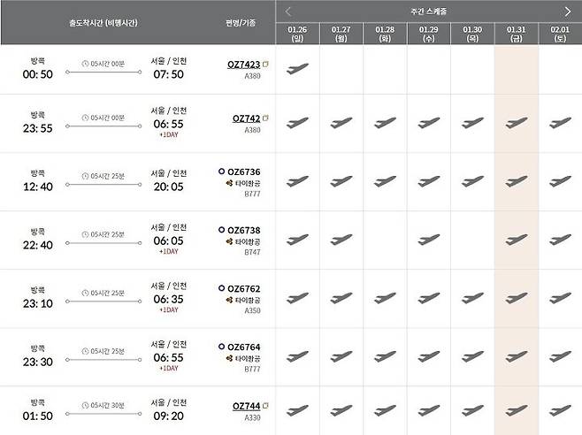 방콕->인천 일요일 하루 3회 왕복운항(공동운항 제외)