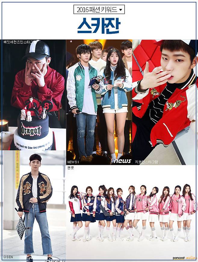 2016 S/S 컬렉션에 대거 등장하면서 그 이름을 알린 스카잔은야구점퍼랑은 또 다른 매력으로 올 한 해 많은 사랑을 받는 아이템이에요. 자수의 강렬함 때문에 스트릿패션으로 자주 볼 수 있는 아이템이며 평범한 패션에 스카잔 하나만 걸치면 모두의 이목을 집중 시켜 당신도 패션 피플로 거듭날 수 있어요.