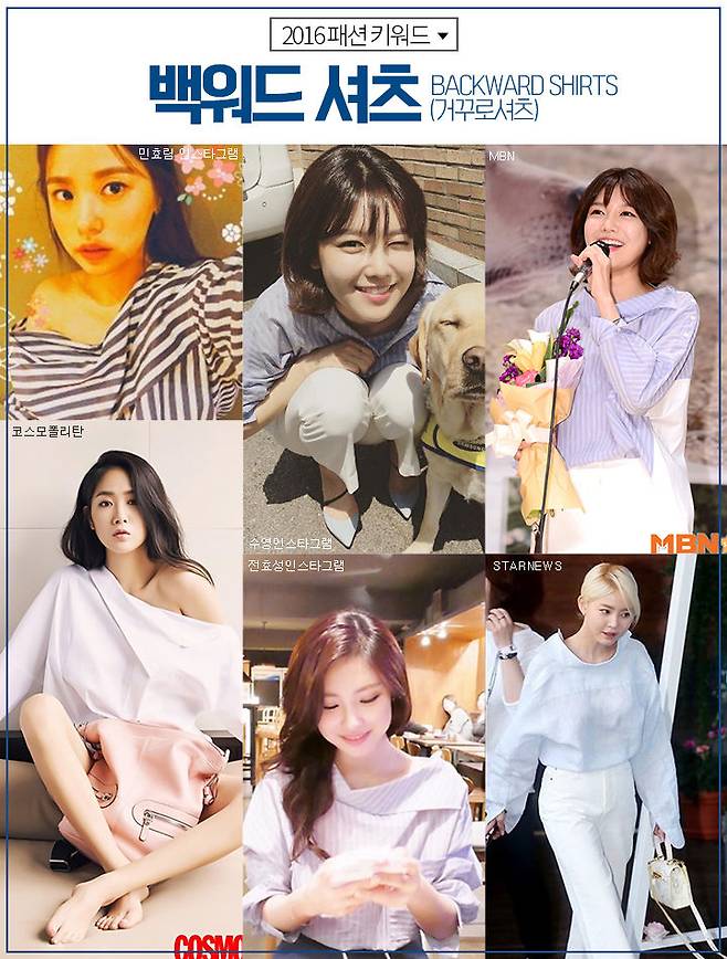 날이 점점 더워질 무렵부터 여기저기서 보이던 백워드 셔츠, 일명거꾸로 셔츠에요. 셔츠의 앞뒤를 바꿔 입는 셔츠죠. 단정하게버튼을 끝까지 채워서 입어도 되고 섹시하게 등 라인을 자랑하고 싶으면 단추를 한두 개만 잠가 보는 건 어떨까요? 유니크하면서도 독특한 스타일링이 되는 거꾸로 셔츠에요.
