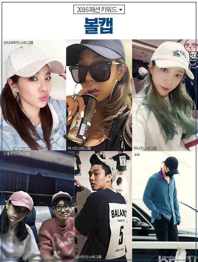 스냅백의 시대가 가고 다시 볼캡의 시대가 돌아왔다고 할 수 있을 정도로 많은 셀럽들이 볼캡을 착용하였어요. 스냅백은 컬러의 폭이 좁았다면 볼캡은 올해 팬톤이 선정한 로즈쿼츠와 세레니티 등의 파스텔 톤도 많은 인기를얻었답니다. 살짝 휘어진 캡이 얼굴을 더 작게 보이게 해주는 효과까지 있어요.