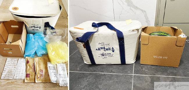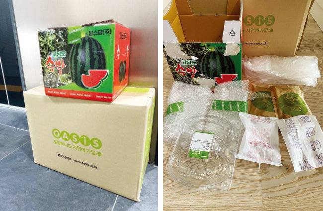 과일 포장은 약간의 아쉬움이 남았다. 수박은 전용 수박 박스에 따로 담겨 왔는데 윗부분에 종이를 덧대고 비닐 테이프로 한 번 더 묶은 것이 과해 보였다. 주문 당일 바나나가 없어 대신 망고를 주문했는데 이 역시 잘 무르는 과일인 탓에 플라스틱 통에 담겨 왔다. 게다가 망고는 플라스틱 망에 하나씩 곱게 포장돼 있었다. 보기에는 좋으나 굳이 이중 포장을 할 필요가 있을까 하는 아쉬움이 남았다.