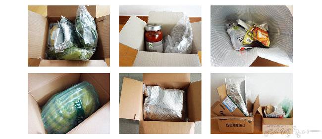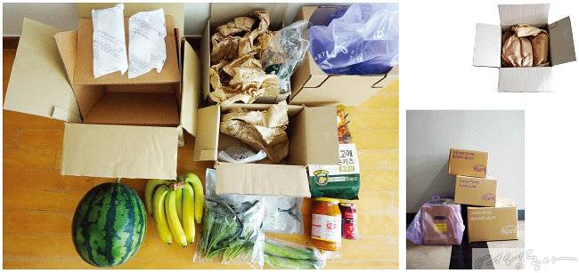 이 외에 바나나와 잼, 파스타 소스같이 깨지거나 망가질 우려가 있는 제품은 각각 종이로 꽁꽁 싸 한 상자에 담았고, 냉동 보관이 필요한 고등어와 돈가스가 담긴 상자에는 드라이아이스를 넣어 신선도를 유지시켰다.