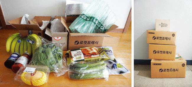 이 외에 바나나와 잼, 파스타 소스같이 깨지거나 망가질 우려가 있는 제품은 각각 종이로 꽁꽁 싸 한 상자에 담았고, 냉동 보관이 필요한 고등어와 돈가스가 담긴 상자에는 드라이아이스를 넣어 신선도를 유지시켰다.