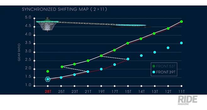 시마노의 산악자전거 구동계 그룹세트인 XTR Di2에 이미 적용됐던 이 2가지의 변속 모드는 싱크로나이즈드 시프트 맵의 설정대로 움직이며, 맵의 설정은 E-튜브 프로젝트 프로그램과 애플리케이션을 이용해 변경할 수 있다. 또한, 극단적인 기어비의 사용을 방지하고, 앞/뒷변속기의 효율적인 작동을 목적으로 하기 때문에 체인링, 카세트 스프라켓, 체인 등의 수명을 늘리고 변속기와 행어의 고장이나 파손을 방지할 수 있다. Di2 버전의 듀라에이스 듀얼 컨트롤 레버 후두 상단에는 시크릿 버튼이 있다. 엄지손가락을 이용해 쉽게 누를 수 있는 시크릿 버튼은 변속 버튼으로 사용하거나 사이클링 컴퓨터의 디스플레이 화면을 전환할 수 있으며, 라이트를 조작할 수도 있어 편리하다. 시크릿 버튼은 E-튜브 프로젝트를 통해 설정할 수 있다.