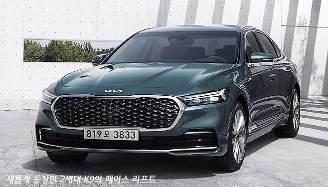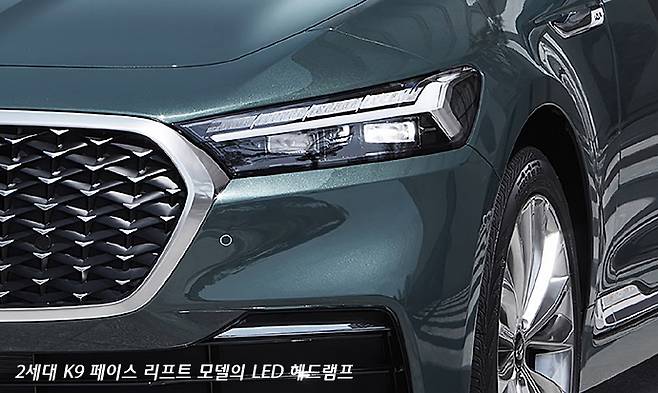 새로 등장한 K9의 페이스 리프트 모델은 기존의 대형 그릴에서 좌우로 폭을 더 늘린, 그야말로 초광폭의 그릴을 보여준다. 여기에 헤드램프는 더 슬림하고 작아져, 그릴의 존재감을 더욱 강조해준다.