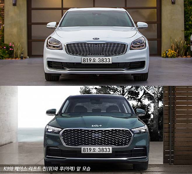 페이스 리프트 된 K9은 전면의 이미지가 그야말로 개벽에 가까운 모습으로 바뀌었다. 좌우로 길게 넓어진 라디에이터 그릴은 가히 충격적인 인상을 준다. 너무 강렬한 인상 때문인지 바뀌기 전의 2세대 모델의 앞 모습이 어땠는지 생각이 나지 않을 정도이다. 이전 모델을 잊어버리게 하는 효과를 가졌다면 성공작이라고 해야 하는 것인지도 모른다.