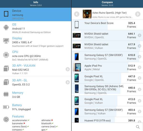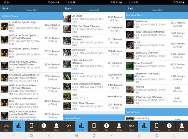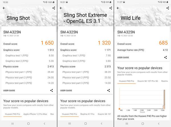 3DMark 테스트 결과 Physics 프레임은 플래그십 갤럭시 S21의 55~60% 정도까지 처리하고 있으나 그래픽 테스트 평균 프레임은 7~8배 정도 떨어지는 것으로 나타났다.