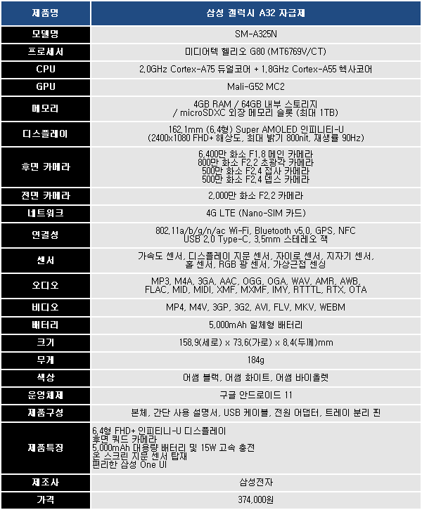 그 밖에 갤럭시 A32는 5,000mAh 대용량 배터리로 충전 걱정 없이 장시간 쓸 수 있으며 이제는 상위 모델에서 사라진 3.5mm 오디오 잭이 제공되어 다양한 유선 이어폰을 연결할 수 있다.