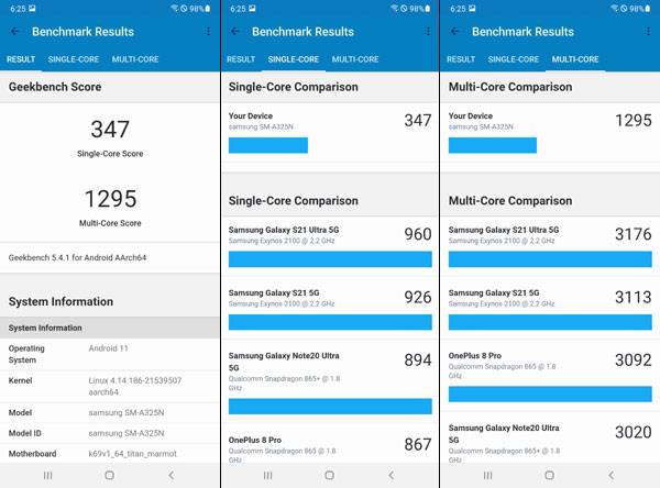 GeekBench 5를 통해 갤럭시 A32 CPU 성능을 측정해보면 최상급 모델 갤럭시 S21에 들어간 엑시노스 2100 대비 싱글코어 성능은 약 36%, 멀티 코어 성능은 약 40% 정도에 불과한 것으로 나타난다.