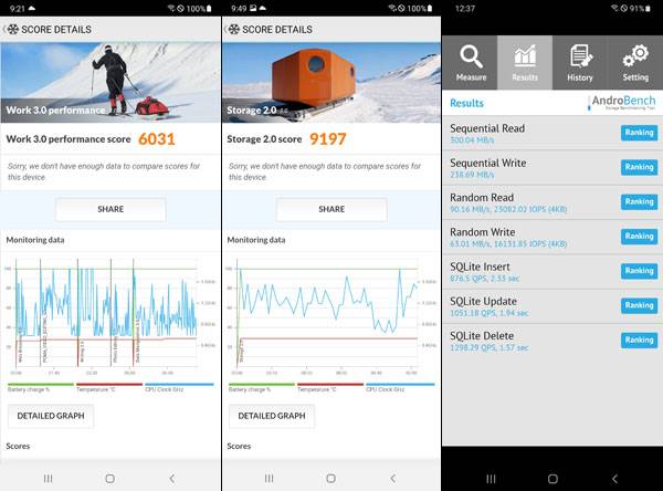 안드로이드용 PCMark 점수는 Work 3.0 성능이 6,031점, Storage 2.0 점수는 9,197점을 기록했다. UL Benchmark 기준 갤럭시 S21과 비교한다면 약 40%의 성능을 제공하는 것으로 나온다.