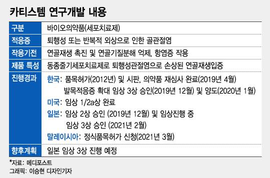 메디포스트 관계자는 "FDA가 한국에서 실시했던 임상결과와 5년 장기추적결과, 시판 후 안전성 조사 결과를 바탕으로 미국에서도 임상 3상을 바로 들어갈 수 있는 조건이 되는 것으로 확인했다"고 설명했다. 이어 "지난해부터 '카티스템' 라이선싱 아웃(기술 수출)을 할 수 있는 파트너를 찾고 있지만 코로나19(COVID-19) 관계로 일정이 좀 지연된 상태"라고 덧붙였다.