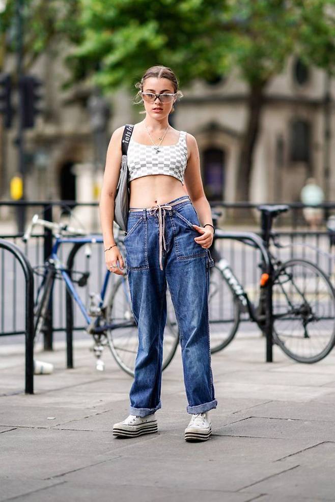 19. 탱크 탑과 스트링 데님 팬츠를 매치한 90년대 복고 스타일