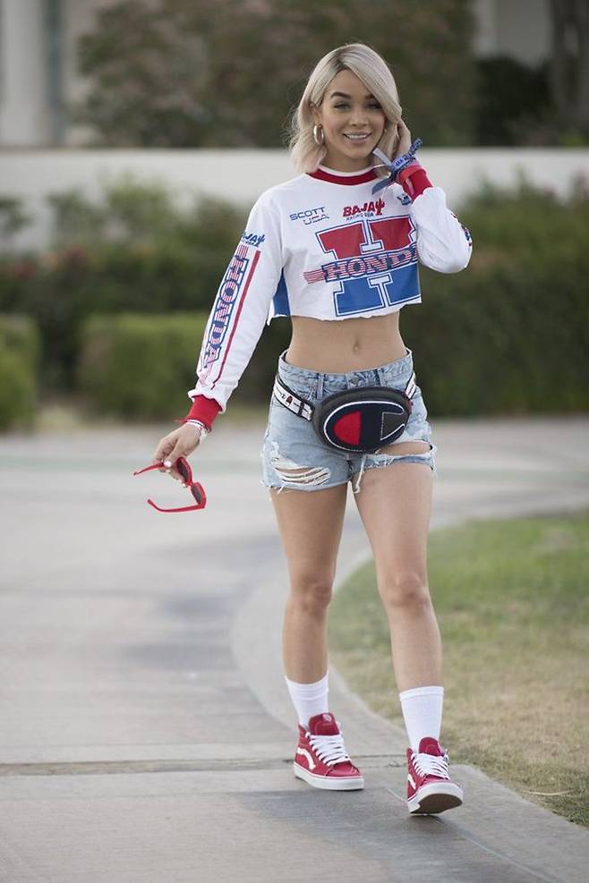 18. 크롭 탑과 해진 데님 쇼츠, 스니커즈를 매치한 스포티 룩