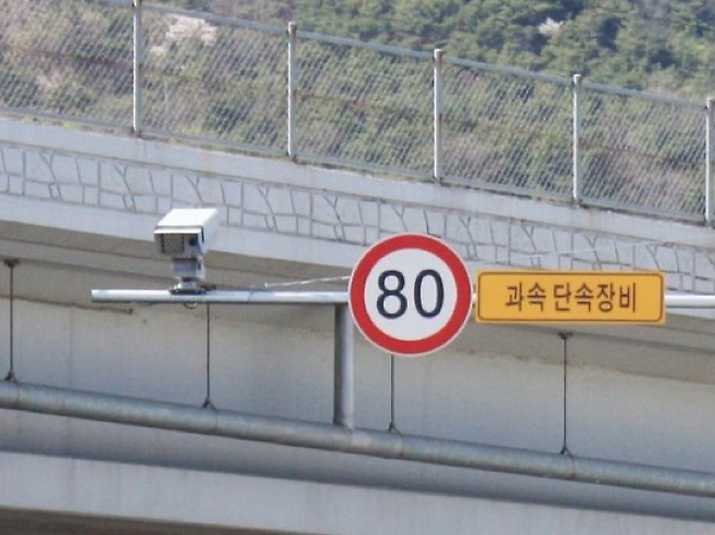 과속 단속카메라 중 가장 흔하게 마주치는 고정식 고정식 과속 단속카메라입니다. 과속을 하게 될 시 도로 위 설치된 고정식 카메라가 앞차량에 있는 번호판을 찍어 범칙금을 내게 되는데요.