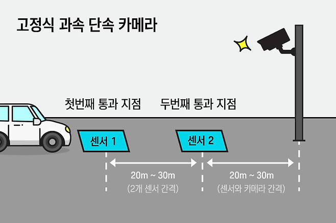 고정식 과속 단속 카메라 앞에는 총 두개의 속도 감지 센서가 매립되어 있습니다. 첫번째 통과 지점의 센서를 통과한 속도와 두번째 통과지점의 센서를 통과한 속도를 평균치를 계산하여 과속을 판단하는 것이죠. 보통 고정식 단속카메라 20~30m앞에 센서를 하나 설치하고, 이렇게 설치한 센서의 20~30m앞에 또 다른 센서를 설치합니다.