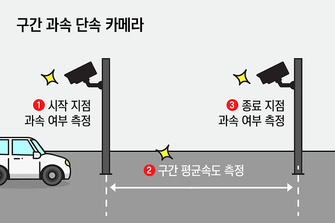 하지만 구간 단속카메라는 과속을 총 세번 측정합니다. 구간이 시작하는 지점과 끝나는 지점에선 고정식 카메라 처럼 작동하여 100m앞에서 부터 과속 여부를 측정하고, 추가로 구간에 진입했던 속도와 구간을 빠져나오는 속도의 평균속도를 측정합니다.