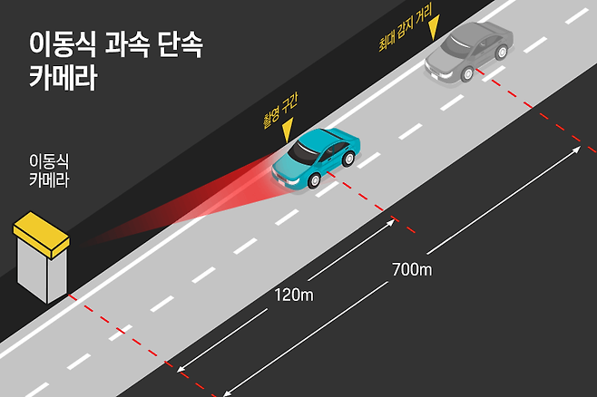 이동식 과속 단속카메라는 다가오는 차량으로 레이저를 쏘아 차량을 맞고 레이저가 돌아오는 시간과 거리로 속도를 계산하여 과속을 단속합니다. 레이저가 닿는 거리 정도에 따라 고정식 카메라보다 더 먼 곳까지 단속을 할 수 있는게 특징입니다.