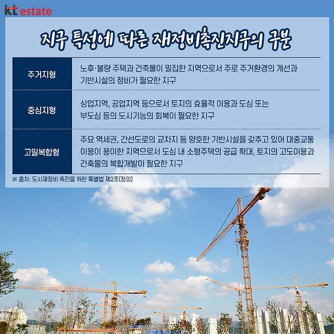 재정비촉진지구는 크게 3가지 형으로 구분됩니다. △첫째 주거지형으로 노후 불량주택과 건축물이 밀집된 지역의 주거환경개선과 기반시설 등이 필요한 지구 △둘째 중심지형으로 상업지역, 공업지역 등의 지역으로 토지의 효율적 이용과 도심 또는 부도심 등의 도시기능 회복이 필요한 지구 △ 셋째 고밀복합형으로 역세권, 간선도로 교차지 등의 양호한 기반시설을 갖추고 대중교통 이용이 편리한 곳으로 소형주택 공급 확대, 토지의 고도이용과 건축물의 복합 개발이 필요한 지구 등입니다.