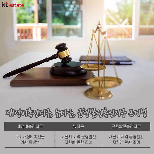 재정비촉진지구는 ‘도시재정비 촉진을 위한 특별법’(이하 도시재정비법)에 적용 받아 지정되고 관리됩니다. 이법은 2006년 6월 시행이 됐습니다. 반면 뉴타운은 지자체의 조례에 의해 지정, 관리됩니다. 서울시의 ‘서울시 지역 균형발전 지원에 관한 조례’가 이에 해당됩니다. 이외에도 ‘도시 및 주거환경정비법’(이하 도정법)에 적용 받아 사업이 관리 받습니다. 이 것이 이들 사업들의 가장 큰 차이로 볼 수 있습니다. 이외에 균형발전촉진지구 역시 서울시 지역 균형발전 지원에 관한 조례를 근거로 지정됩니다.