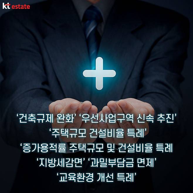 예를 들어 건폐율, 용적률 등의 한도를 기준보다 완화해 주거나 우선 사업추진이 가능하게 하고 증가하는 용적률에 따라 추가로 짓는 주택의 건설 비율도 일반 정비사업과 달리 탄력적으로 조정이 가능합니다.