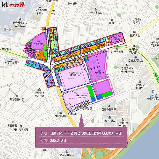 구의•자양재정비촉진지구 내에는 자양1구역, 자양4구역, 자양5구역, 구의3구역 등의 사업이 진행 중입니다. 자양1구역은 동부지방법원 및 동부지방검찰청 이전부지와 KT부지의 개발을 통해 공동주택, 호텔, 오피스텔, 업무시설 등이 들어설 계획이며 자양5구역은 동서울우편집중국 부지가 포함 돼 업무시설과 상업시설, 공동주택 등이 들어설 계획입니다.