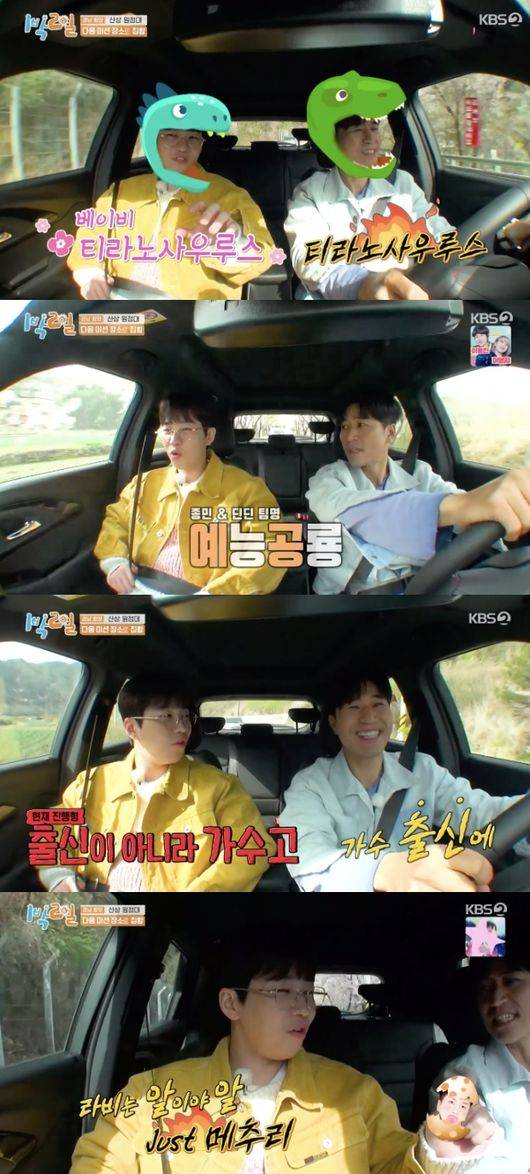 이날 딘딘은 “종민 형이 이 바닥에서 20년 이상 굴렀다. 예능 공룡이다. 그 뒤를 따르는 게 누구냐? 바로 나”라며 “형은 티라노사우루스, 나는 아기 티라노사우루스”라고 자화자찬했다.