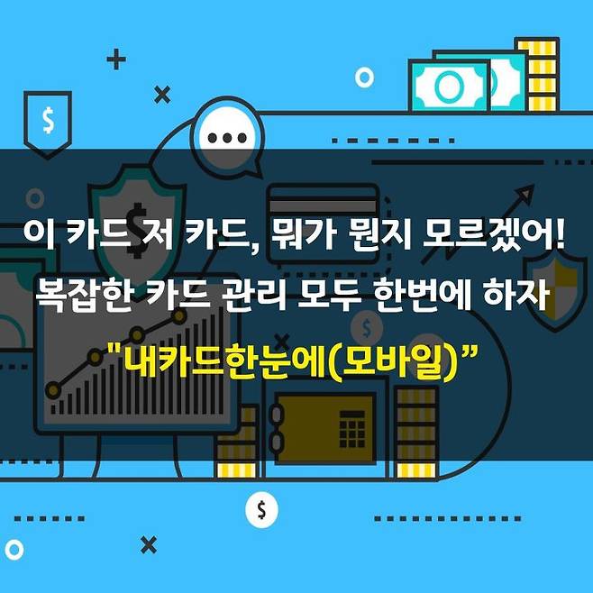 그런 불편함을 해결하기 위해, 금융감독원에서는 단 하나의 어플리케이션으로 카드 관련 정보들을 검색하실 수 있는 '내 카드 한 눈에' 모바일 서비스를 실시하였습니다.