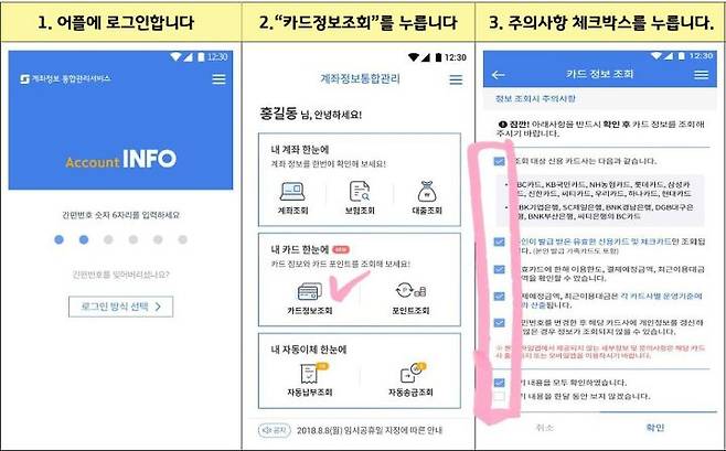 3) 여러분의 카드 정보 조회에 대한 주의사항을 읽어보신 후, 동의하시면 체크박스를 누르고 확인을 눌러주세요.